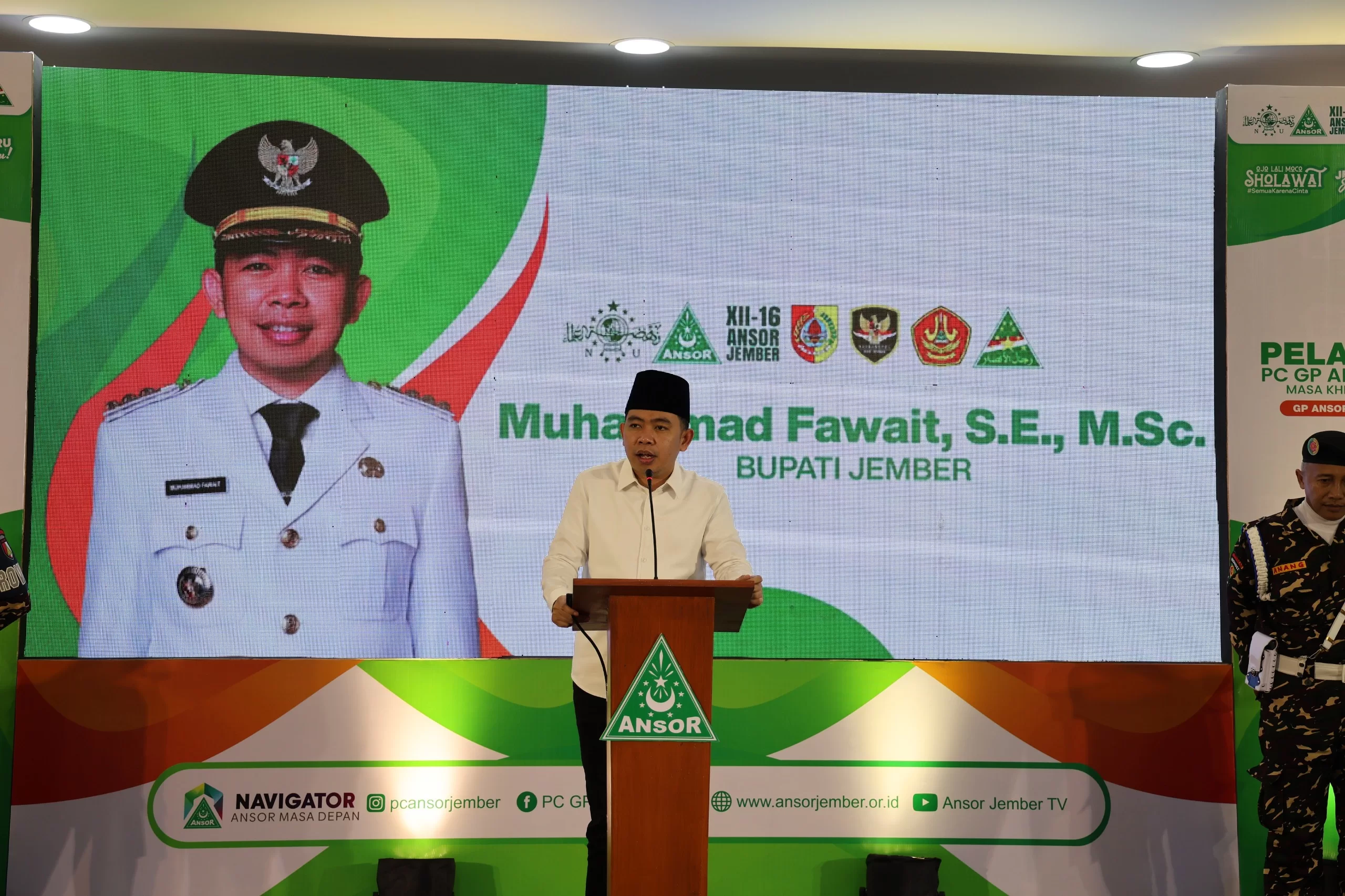 “Bukan bupati yang lain, tapi bupati santri yang pernah berproses di Ansor,” katanya. Gus Fawait berharap dukungan dan doa dari keluarga besar Ansor agar kepemimpinannya dapat terus berjalan dengan keselamatan, kesabaran, dan kedewasaan, serta mampu membawa Jember menuju arah yang lebih maju dalam empat tahun ke depan.