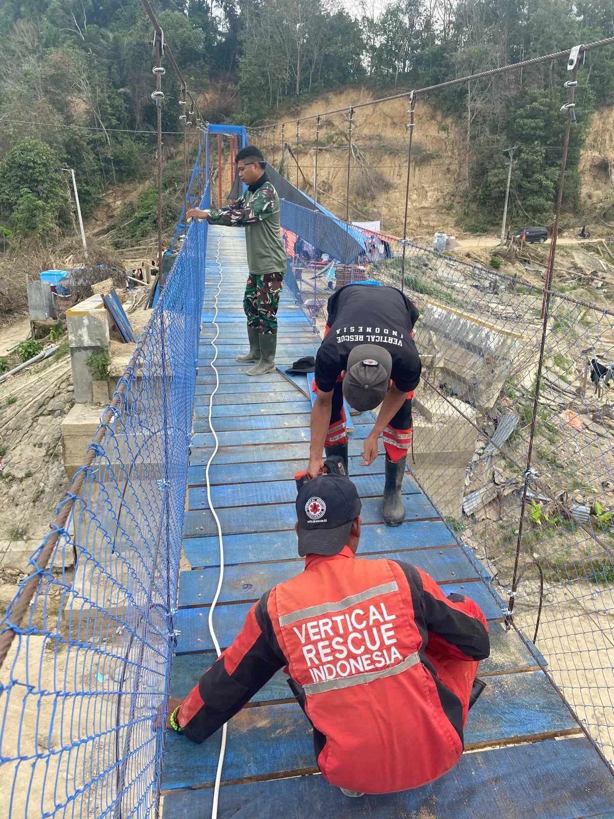 Kondisi serupa juga tampak di Desa Lubuk Sidup, Kecamatan Sekerak, Kabupaten Aceh Tamiang. Jembatan gantung sudah membentang, para petugas TNI tengah melakukan penyelesaian akhir dengan membuat pembatas kiri-kanan.