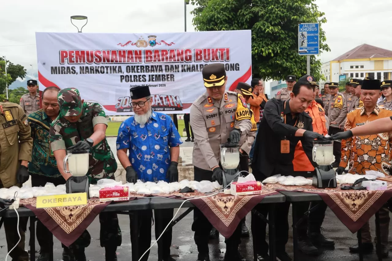 Pandhalungan.com, Jember – Komitmen menjaga kekhusyukan ibadah di Bulan Suci Ramadan 1447 H terus ditegaskan. Polres Jember bersama jajaran Forum Koordinasi Pimpinan Daerah (Forkopimda) Kabupaten Jember memusnahkan ribuan botol minuman keras, narkotika, hingga knalpot tidak sesuai spesifikasi hasil Operasi Penyakit Masyarakat (Pekat), Kamis (26/2/2026).