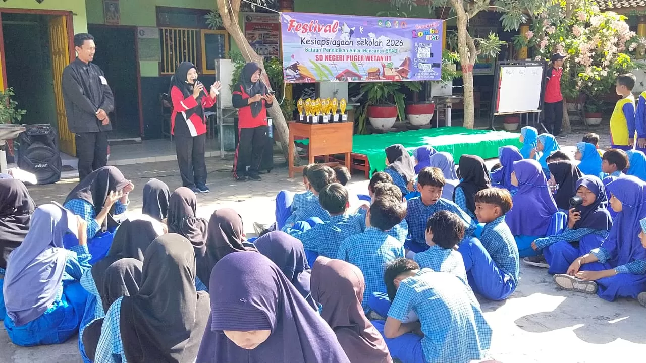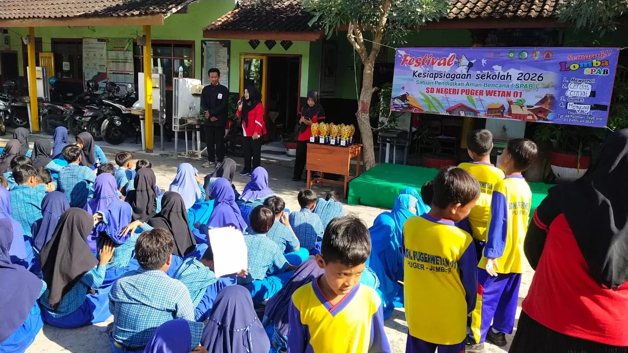 Pandhalungan.com, JEMBER- Sebanyak 165 siswa dan 16 guru di SD Negeri Puger Wetan 01, Rabu (04/02/26) mengikuti festival kesiapsiagaan bencana. Untuk penyampaian pesan edukasi pada siswa, festival dikemas dengan lomba mewarnai, cerdas cermat, games dan menyanyi yang semuanya mengandung tema kesiapsiagaan bencana.